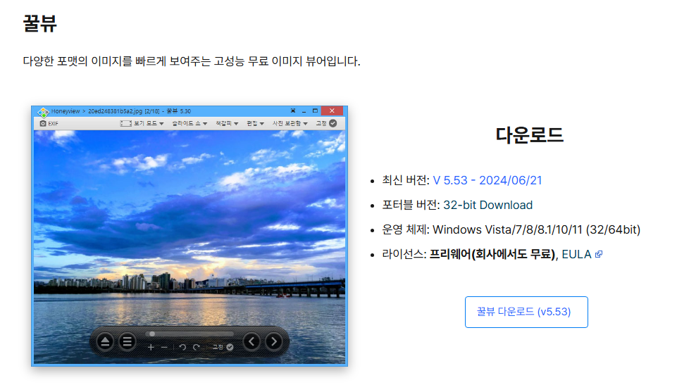 '꿀뷰 다운로드 (v5.53)'을 클릭합니다.
